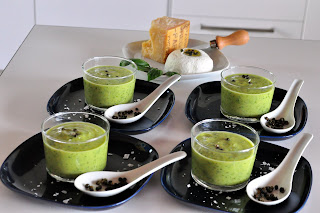 Servir dans des bols transparents avec des cristaux de sel et le poivre vert