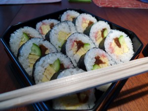 Faire 5 petits rouleaux avec les 1/4 de feuilles de nori